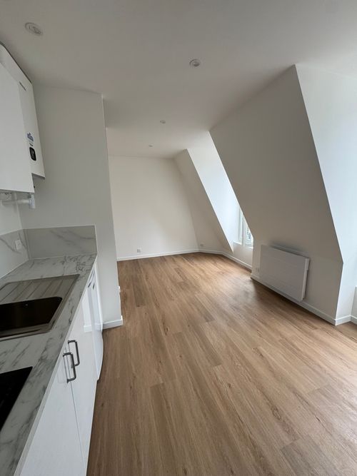 Nous avons réalisé une belle transformation d'une chambre de bonne située dans le 14ᵉ arrondissement de Paris. À partir de deux appartements distincts, nous avons su créer un espace unique, bien aménagé et baigné de lumière, pour le plus grand plaisir de ses occupants.